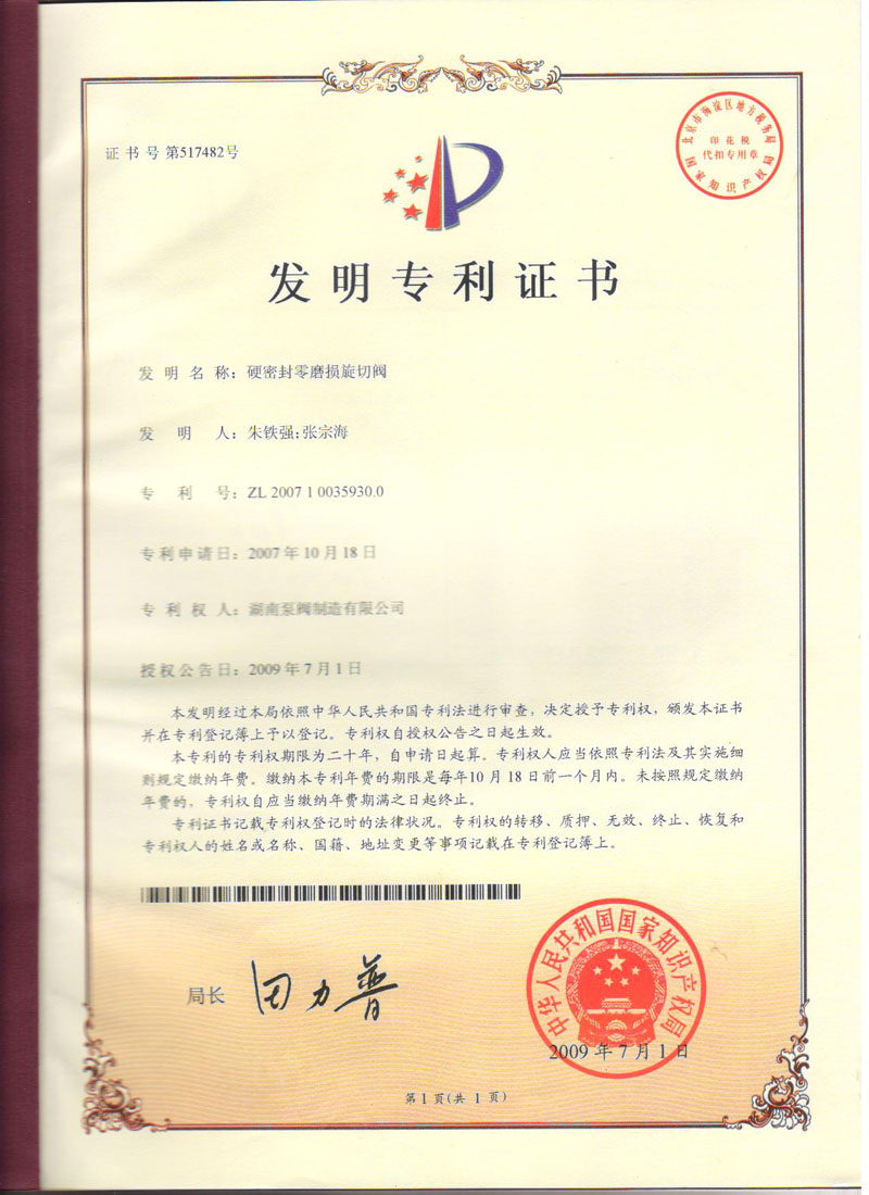 (双向自密封阀)(发明专利证书)专利号:ZL 2016 1 1232241.4
